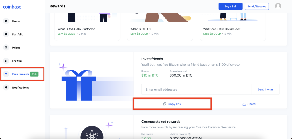 To get your own unique Coinbase.com link and promo code, head to the ‘Rewards‘ tab, scroll down and you’ll find your referral link.