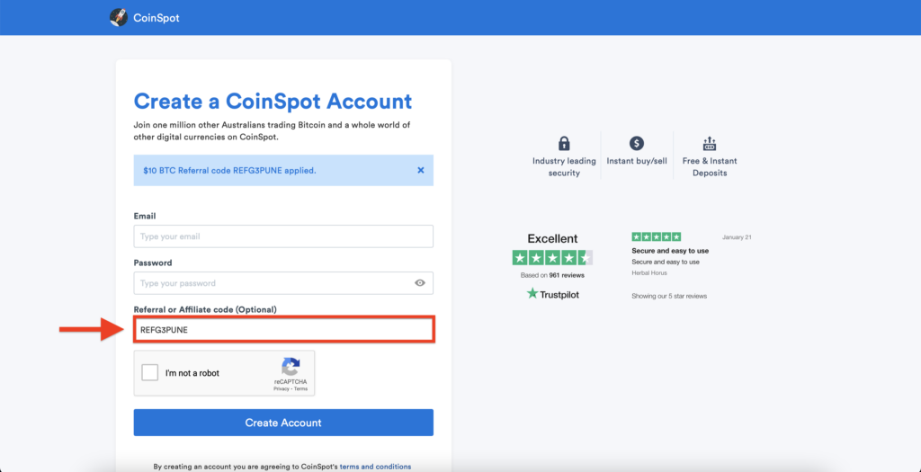 - CoinSpot referral code REFG3PUNE should already be applied, if not, enter it into the referral code box