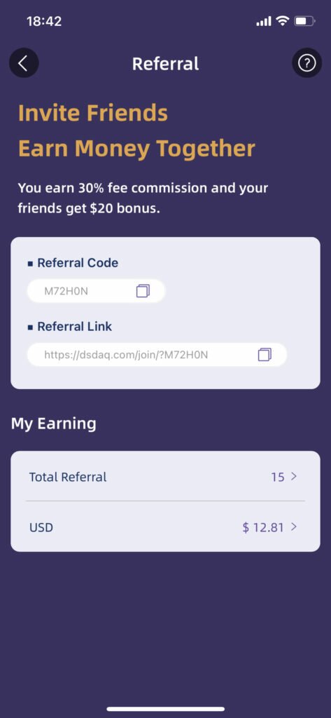 After you’ve claimed the Dsdaq 50% deposit bonus, there’s another way you can earn some FREE cryptocurrency. Refer other traders to the Dsdaq app and earn when they trade.